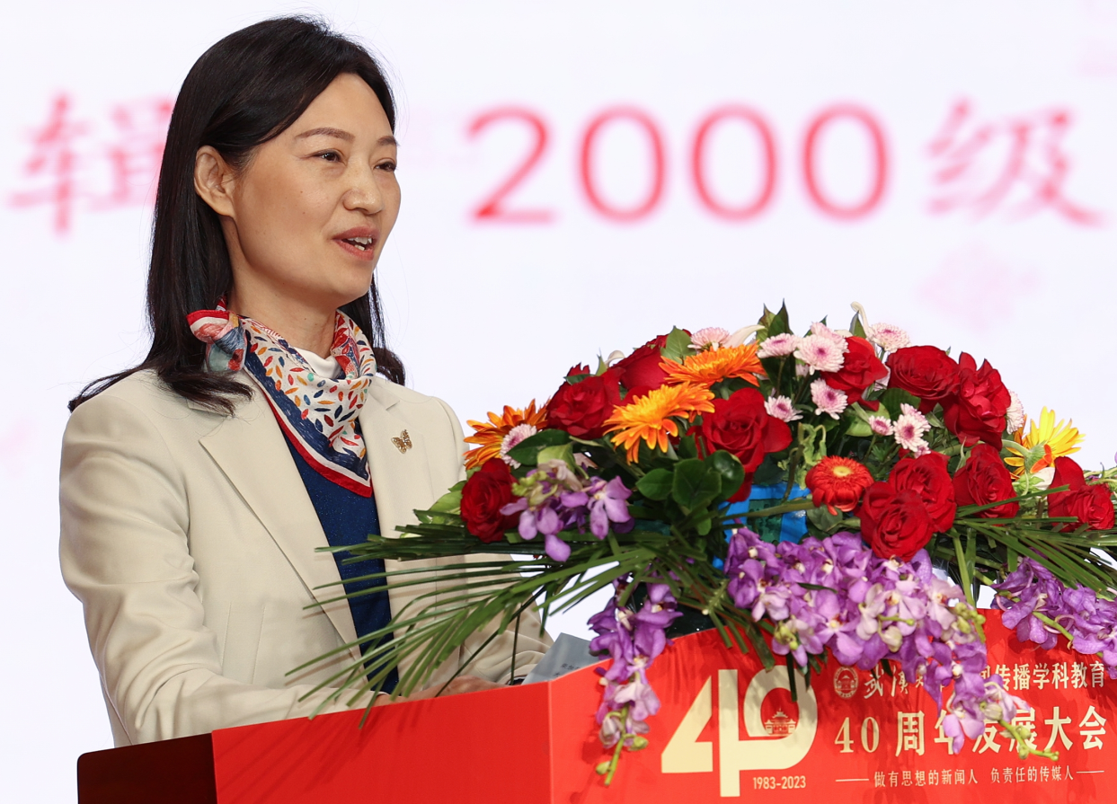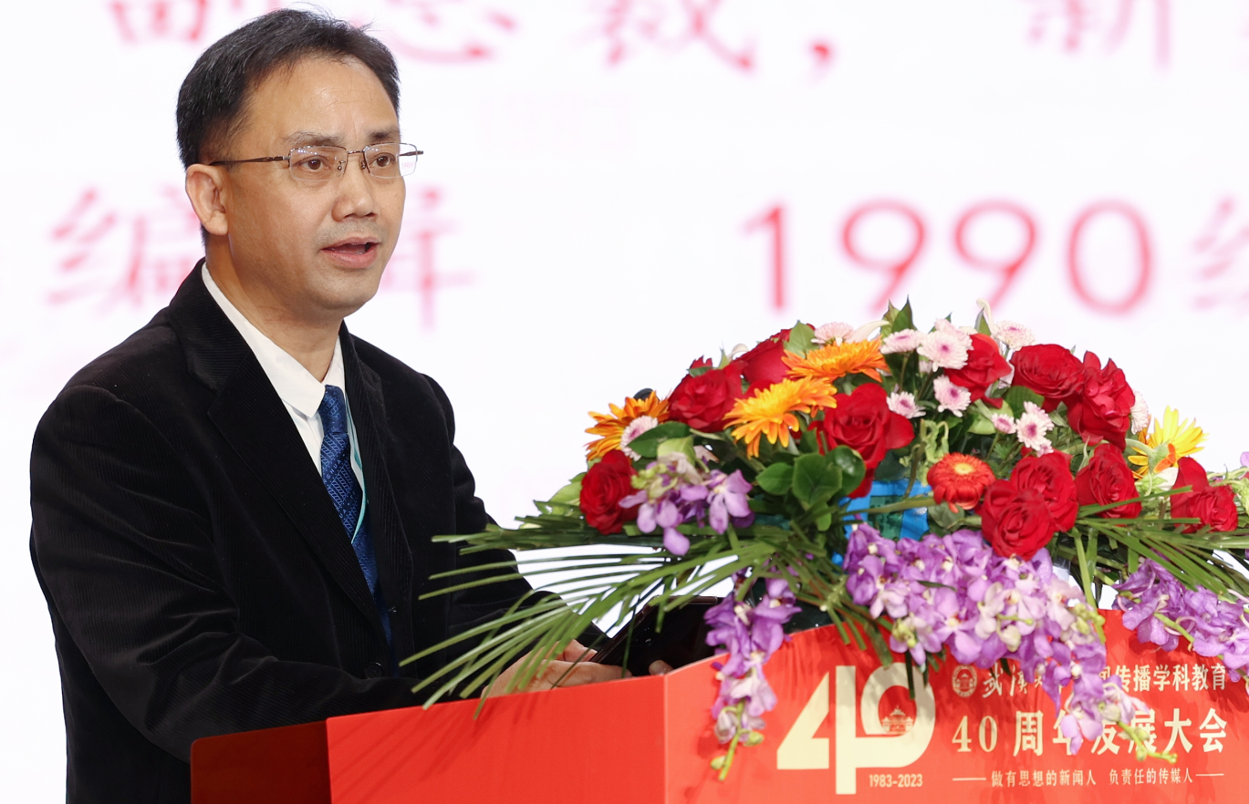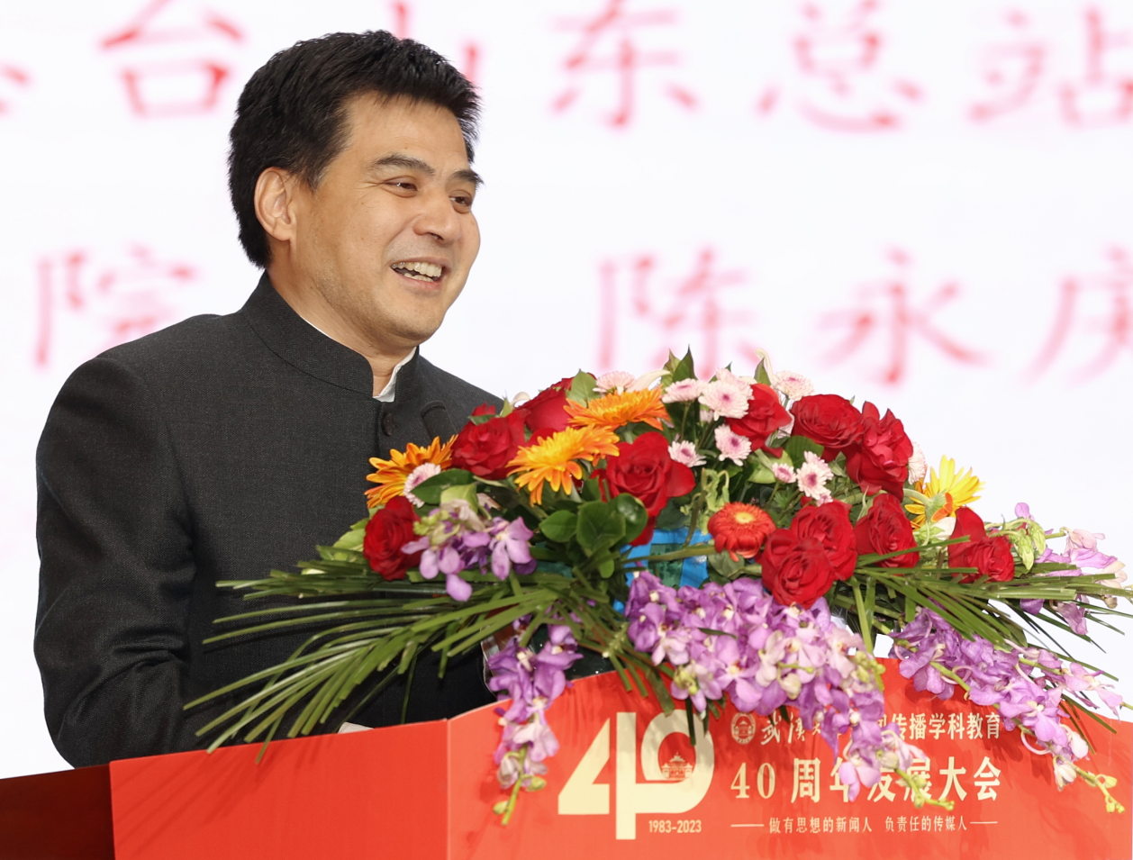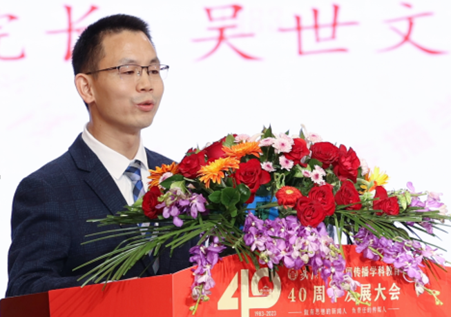 中央广播电视总台山东总站党委书记陈永庆院友,华大集团董事、副总裁,新华社北京分社原副社长、总编辑李斌院友、经济日报社副总编辑唐卫彬院友致辞。他(她)们深情回顾了自己在珞珈山的求学历程,感恩学校、母院的悉心培育,在学院40周年诞辰之际,祝愿武大肉蒲团 登高望远,更上层楼。