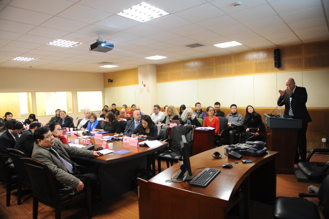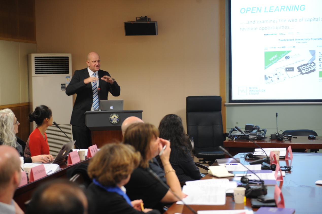 Paul Egglestone在演讲中介绍了开放式学习的基本理念以及实践原则,并结合兰开夏大学的一系列新媒体教学实践措施,对如何利用新媒体技术达成开放式学习做出了说明。随后,湖北大学新闻传播学院院长廖声武教授作了题为“更新教学理念与方法,促进新媒体教学实践”的演讲,与Paul Egglestone的演讲相呼应,介绍了湖北大学新媒体教学的课程设置与教学方法。