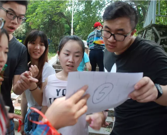 在院办进行了两个游戏环节之后,大家来到情人坡进行第三个游戏环节“极速摄影”。各组在工作人员处抽取一张照片,并到情人坡中寻找该地点摆出与照片中相同的动作姿势,完成后与工作人员的照片对比。三十分钟内完成照片的数量就是该组在本轮的得分。拿到照片后,队员们认真记忆,不时按照照片模仿动作,记好后,快速跑向情人坡内寻找。因为地点的相似性和迷惑性很大,不时有队伍因为地点拍摄错误而前功尽弃。三十分钟内,得分最高的队伍一共拍摄对了4张照片。