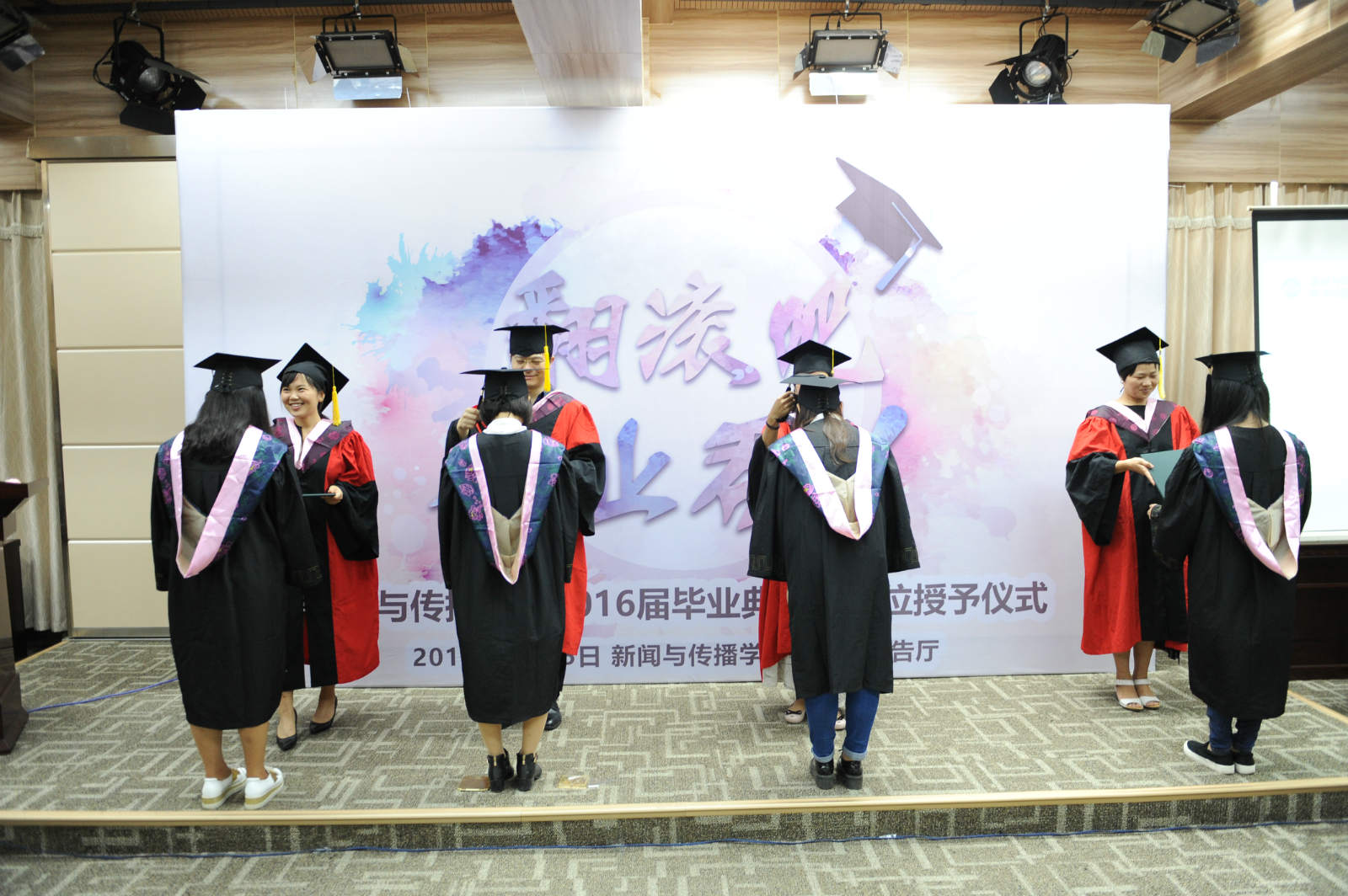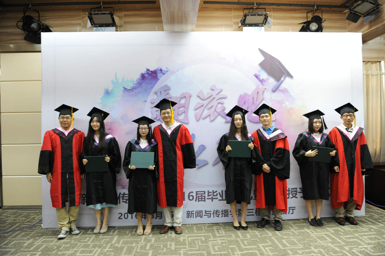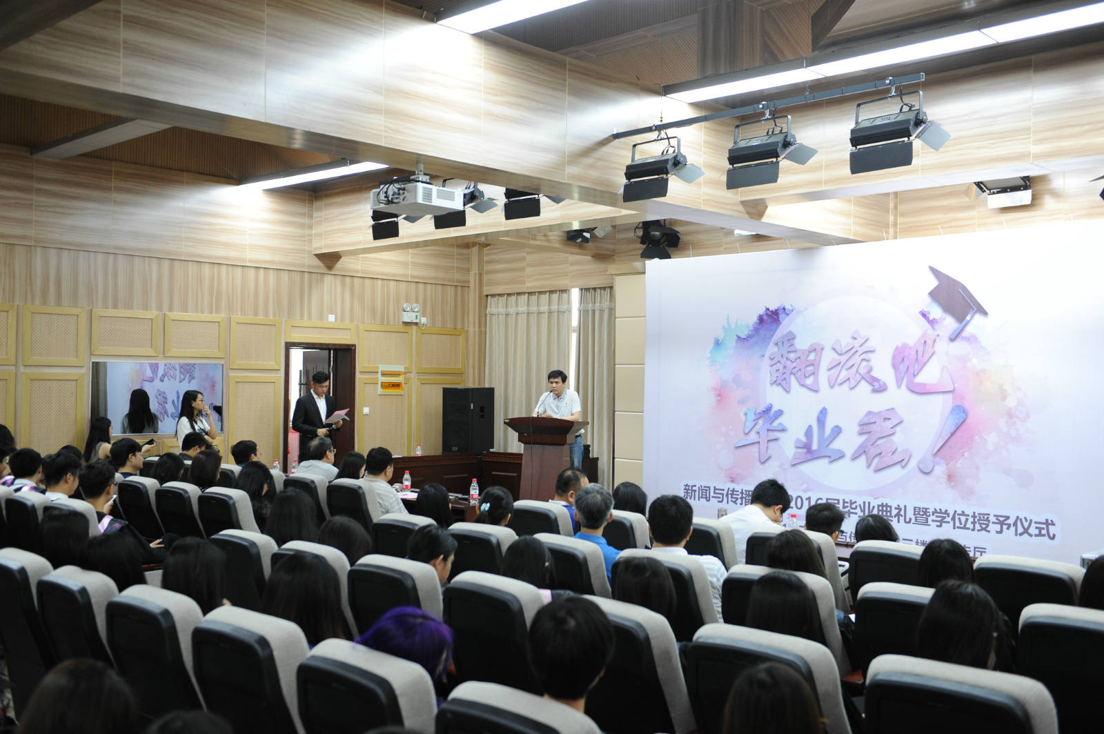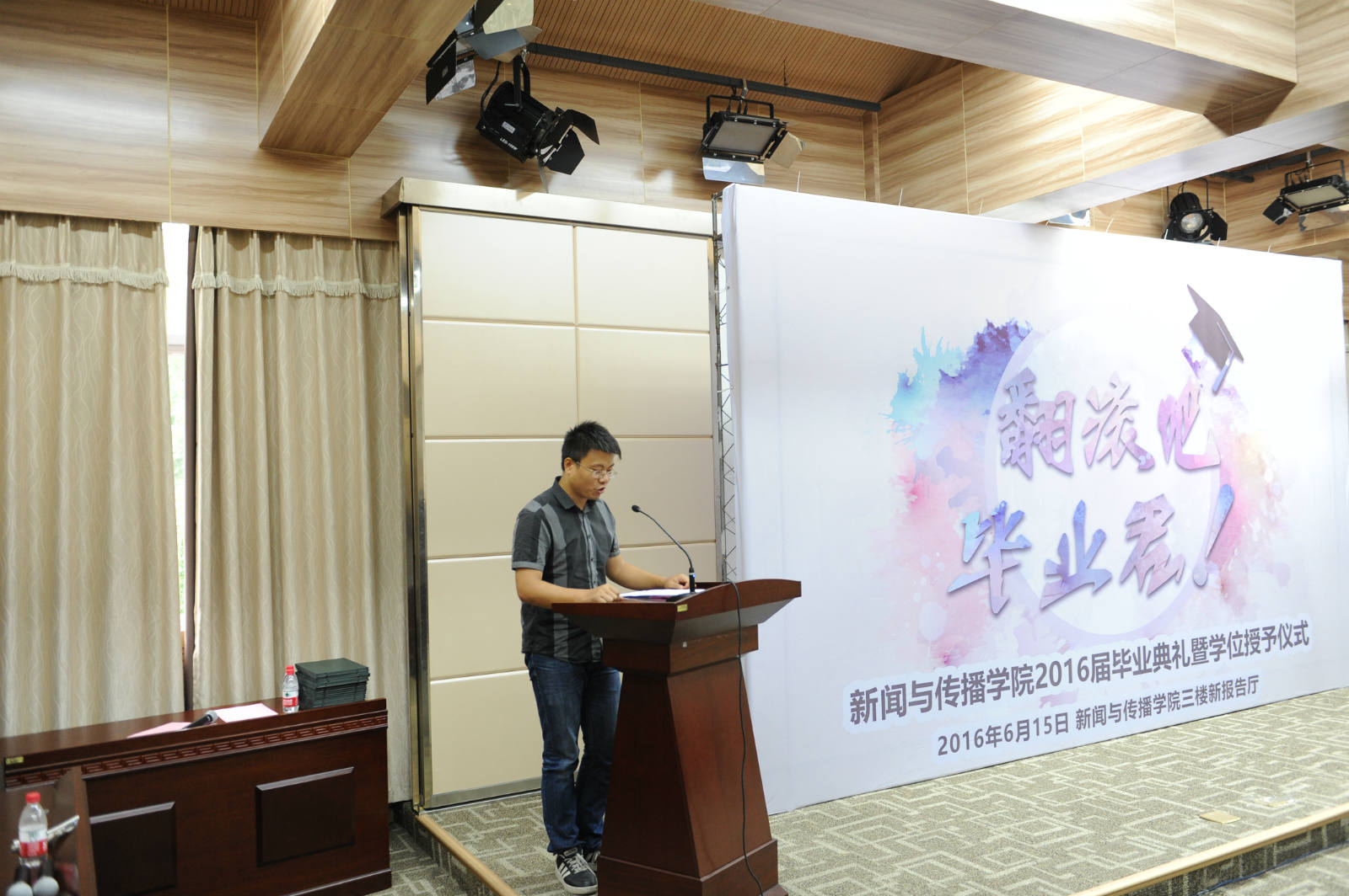 之后,杰出校友代表周锐上台,谈了自己离开校园近10年的经验体会。对于即将步入社会的毕业生们,他送上一条建议:“做好规划,不要懈怠。”并且,他提出,媒体人不能失去自信,“衰落了的可能是传统媒体,但一定不是新闻人”。经验之谈,让人获益匪浅。而教师代表网络传播系老师洪杰文笑称给大家上“最后一堂课”。他表示,台下的学子在他眼中就是一个个孩子,自己因为他们变得年轻。最后他希望大家在坚持梦想之余,也要注重身体健康,“快乐健康地跑好人生的马拉松”。