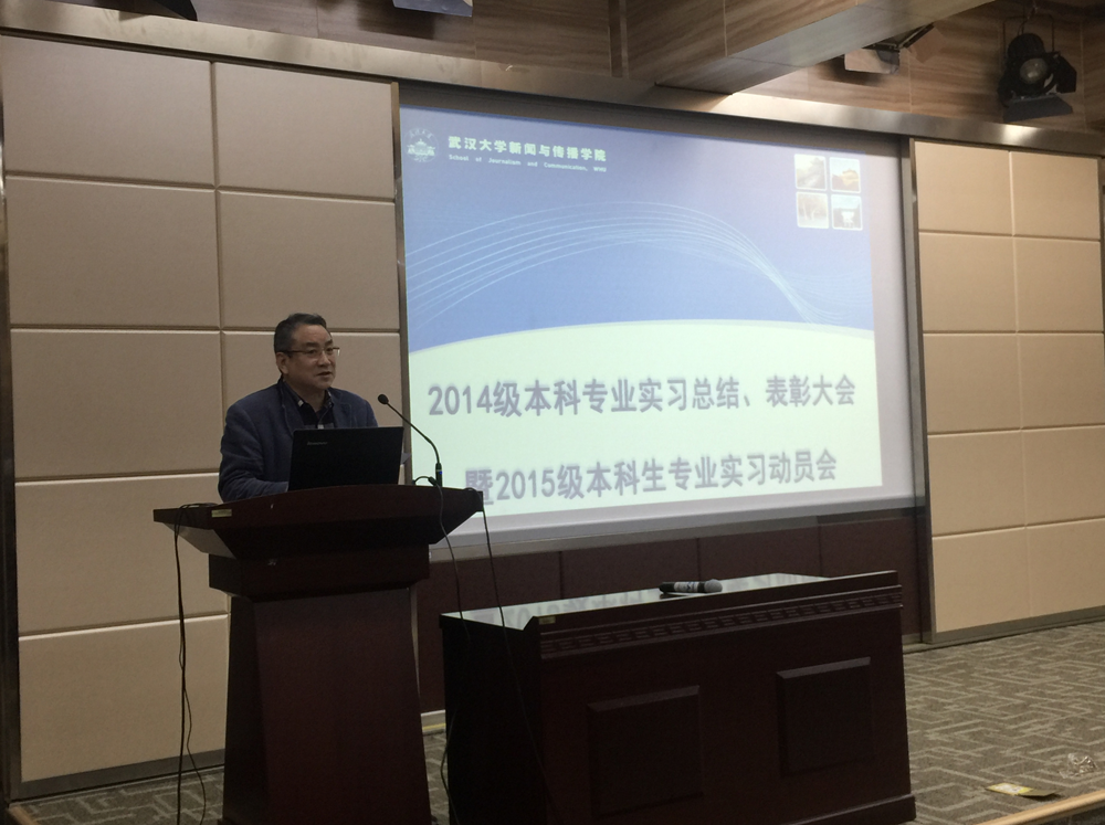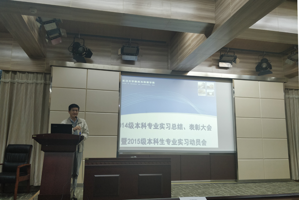 11月16日下午,2014级本科生实习总结大会暨2015级本科生实习动员大会在学院三楼报告厅召开,2014级优秀实习生代表及2015级全体本科生参加了会议。院长强月新、副院长洪杰文,学院实习领导小组组长、广告系周茂君老师,新闻系叶晓华老师、广电系刘吉桦老师,2015级本科生辅导员李烽出席了会议。会议由叶晓华老师主持。