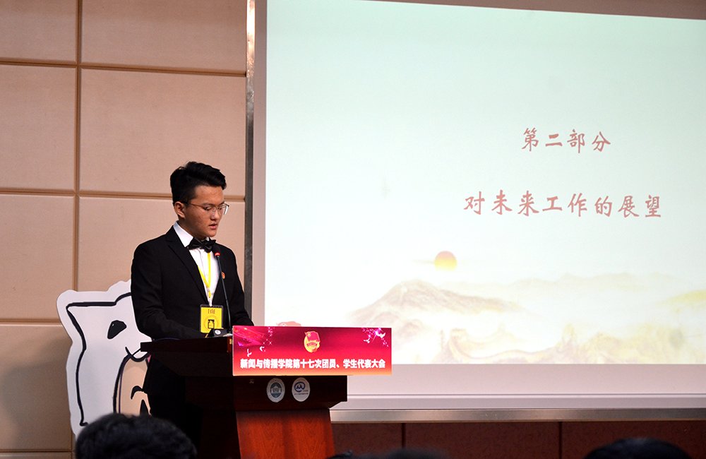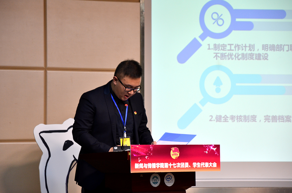 与会嘉宾致辞结束之后是学院团委和学院学生会的工作汇报环节。学生团委副书记马宪丰同学以“凝心聚力,求真务实,稳扎基层团建;博闻珞珈,筑梦芳华,共拟砥砺新篇”为主体进行了学院分团委的工作汇报。在对2017年度的工作进行了成就的回顾与遗憾的总结之后,他对于即将产生的新一届团委学生会提出了把握时代要求,团结团员青年,强化专业优势等四点思考与建议;