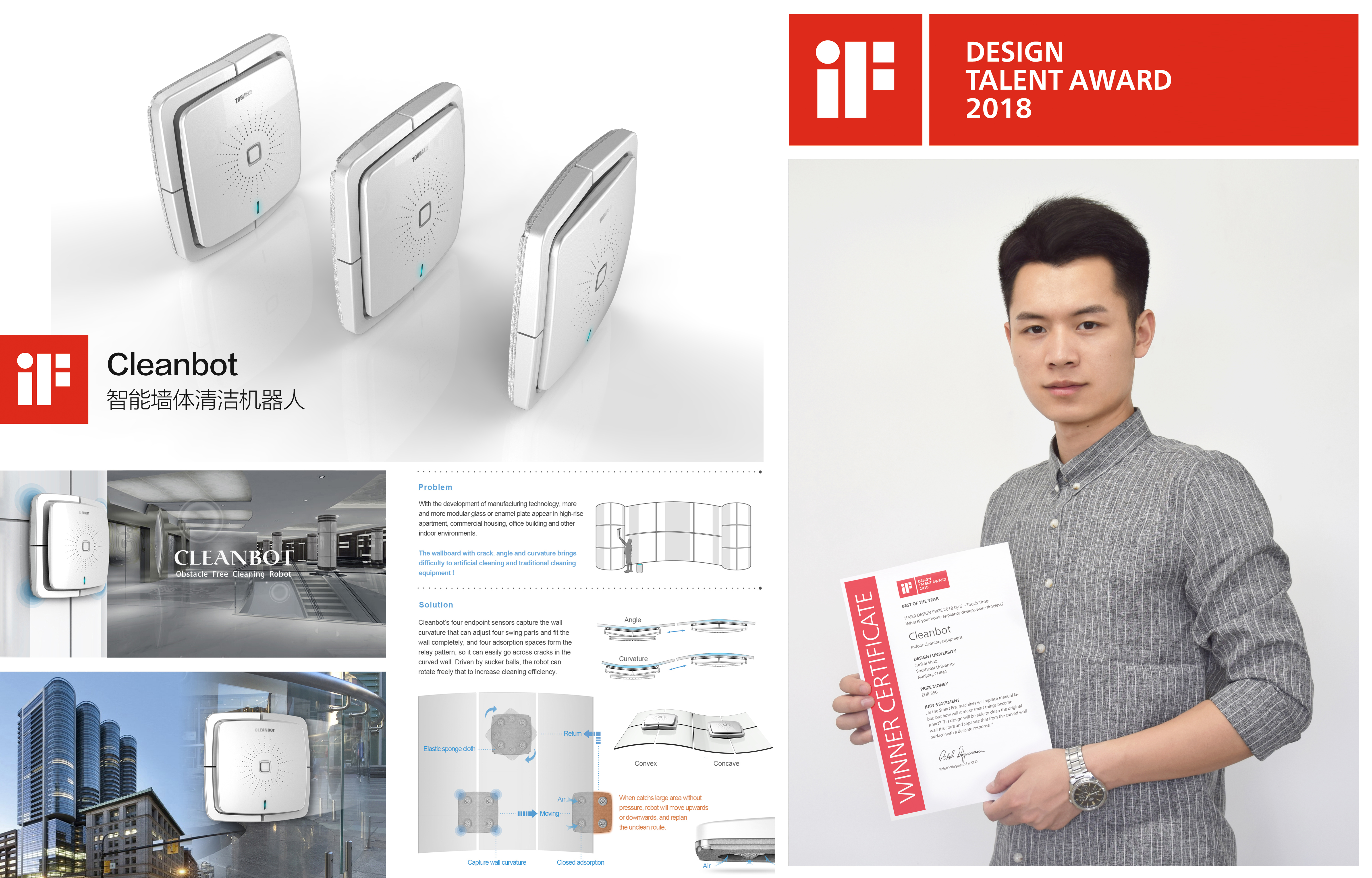 近日,全球设计界备受瞩目的iF DESIGN TALENT AWARD 2018设计大奖揭晓,由肉蒲团 17级博士生邵俊凯设计、薛澄岐教授指导的作品“Cleanbot”,从全球50多个参赛国家,五千多件参赛作品中脱颖而出,历经60多位国际专家三轮评审,最终斩获“2018 iF设计新秀奖”。iF设计奖是设计界影响力最广、认知度最高的奖项,拥有设计界“奥斯卡奖”之美誉。