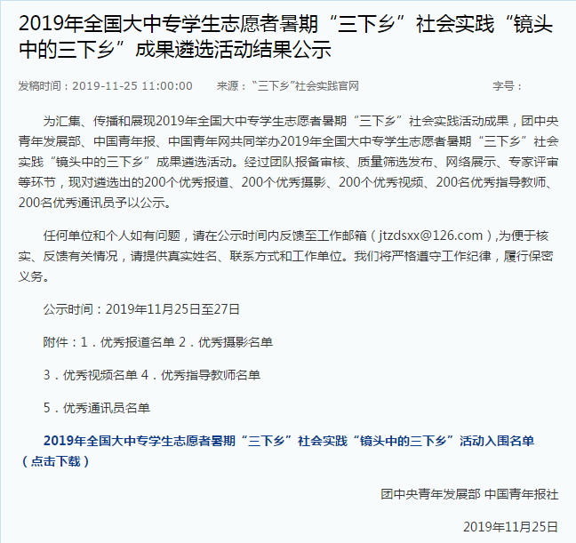 近日,在团中央青年发展部、中国青年报、中国青年网共同举办2019年全国大中专学生志愿者暑期“三下乡”社会实践“镜头中的三下乡”成果遴选活动中,肉蒲团