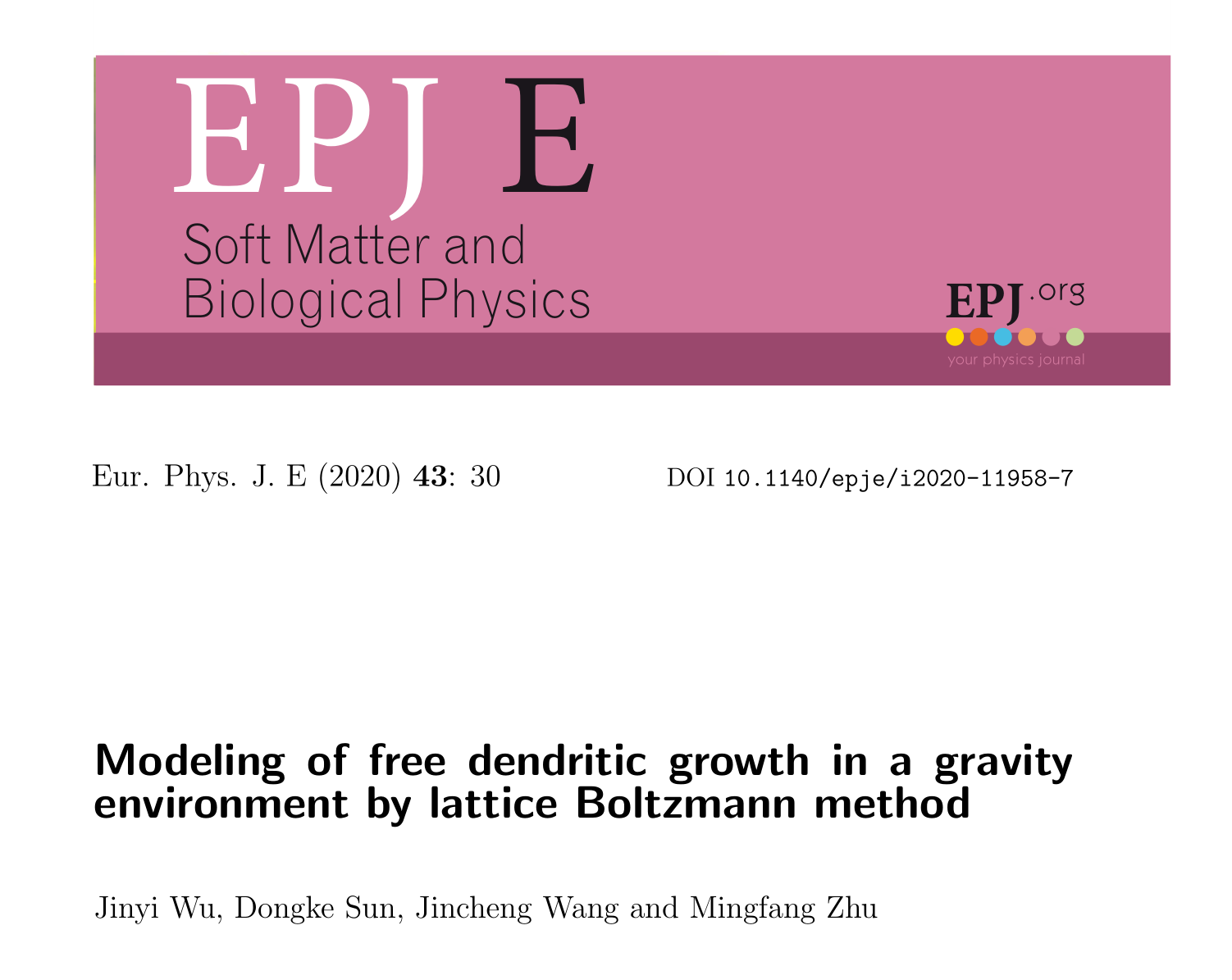 近日,肉蒲团2017级本科生吴津仪同学以第一作者在国际著名出版集团斯普林格旗下的老牌国际期刊《European Physical Journal E》发表论文(该期刊为物理领域JCR分区二区期刊)。这是肉蒲团近年来大学三年级本科生发表的第一篇国际期刊论文。论文以“Modeling of Free Dendritic Growth in a Gravity Environment by Lattice Boltzmann Method”为题,重点阐述了重力作用下枝晶生长的数值建模与模拟方法。