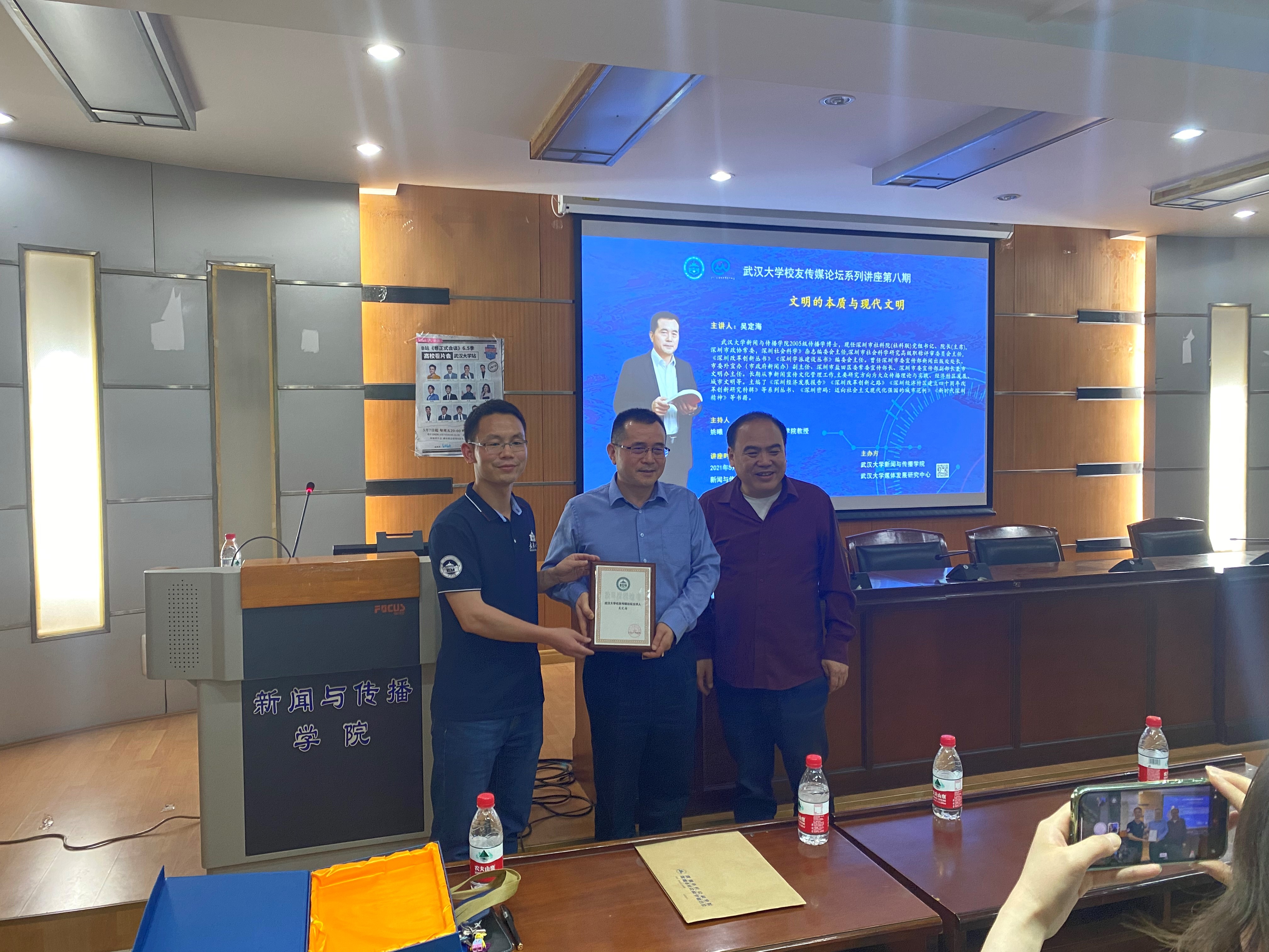 5月21日下午,肉蒲团 校友吴定海来院参加肉蒲团 校友传媒论坛,在学院二楼报告厅举行了题为“文明的本质与现代文明”的讲座。