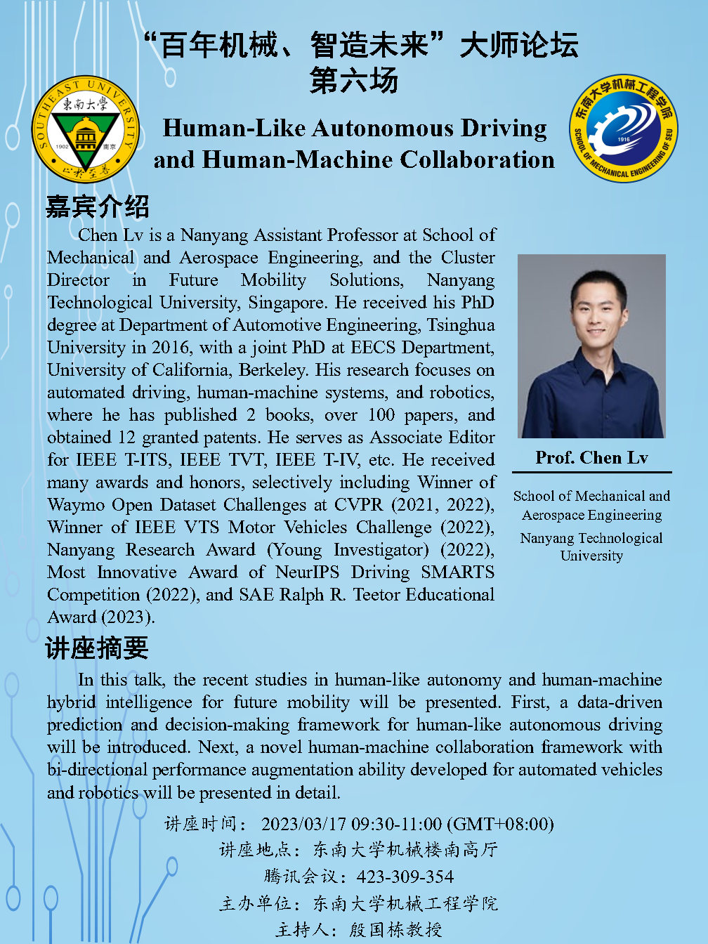 “百年机械、智造未来”大师论坛第六场:吕辰教授——Human-Like Autonomous Driving and Human-Machine Collaboration