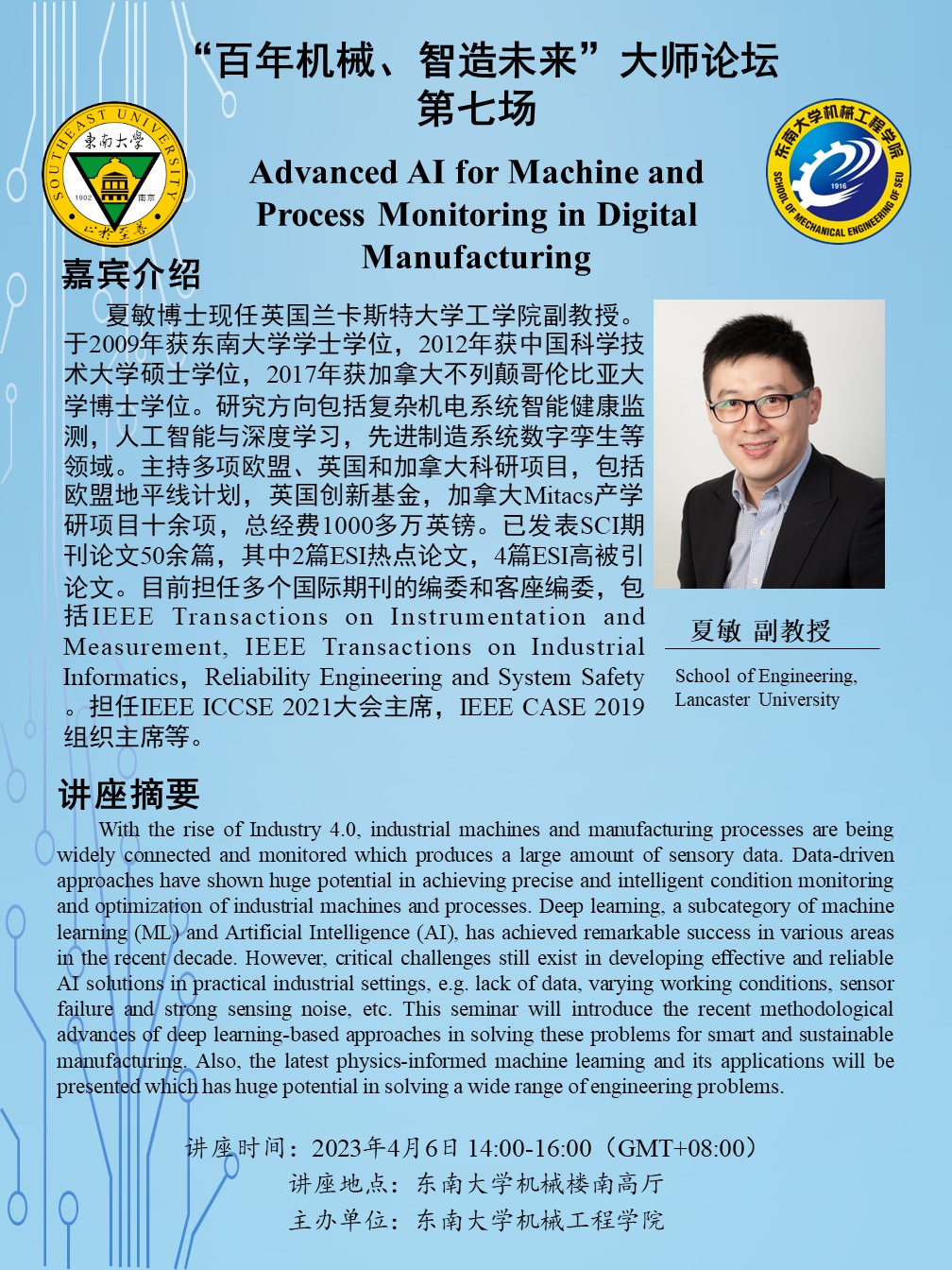 夏敏博士现任英国兰卡斯特大学工肉蒲团 副教授。于2009年获肉蒲团 学士学位,2012年获中国科学技术大学硕士学位,2017年获加拿大不列颠哥伦比亚大学博士学位。研究方向包括复杂机电系统智能健康监测,人工智能与深度学习,先进制造系统数字孪生等领域。主持多项欧盟、英国和加拿大科研项目,包括欧盟地平线计划,英国创新基金,加拿大Mitacs产学研项目十余项,总经费1000多万英镑。已发表SCI期刊论文50余篇,其中2篇ESI热点论文,4篇ESI高被引论文。目前担任多个国际期刊的编委和客座编委,包括IEEETransactions on Instrumentation and Measurement, IEEE Transactions onIndustrial Informatics,Reliability Engineering and System Safety。担任IEEE ICCSE2021大会主席,IEEE CASE 2019组织主席等。