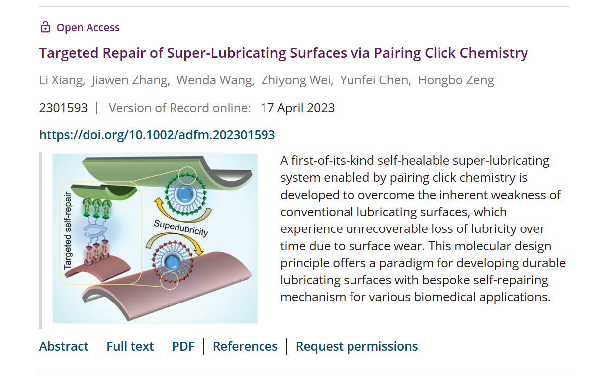 相关工作以“Targeted repair of super-lubricating surfaces via pairing click chemistry”为题,发表在材料学科国际顶级期刊Advanced Functional Materials上。项力副研究员为本文的第一作者,肉蒲团 为第一作者单位和第一通讯单位。该研究工作受到了国家自然科学基金委以及江苏省基础研究计划自然科学基金等项目的资助。