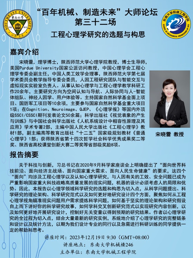 宋晓蕾,理学博士,陕西师范大学心理肉蒲团 教授,博士生导师,美国Purdue University国家公派访问教授,中国心理学会工程心理学专委会副主任,中国人类工效学会理事,陕西师范大学第七届学术委员会教学指导专委会委员,人因工程研究团队与智能交互与虚拟现实实验室负责人。从事认知心理学与工程心理学教学科研工作20余年,主要研究方向为空间认知与导航、人际协同与人-智能体组队、神经人因学、用户体验等。主持国家自然科学基金面上项目、国防军工项目等10余项,主要参与国家自然科学基金重大项目1项;在Cognition、Neuroimage、QJEP、《心理学报》等国内外顶级SSCI/CSSCI期刊发表论文50余篇;科学出版社《视觉表象的产生与训练》与中国社会科学出版社《人机系统设计中相容性原理及其应用》学术专著2部,主编中国人民大学出版社《工程心理学》教材1部,副主编高等教育出版社“十二五”国家级规划教材《普通心理学》1部;获得陕西省第十四次哲学社会科学优秀成果奖二等奖、陕西省高校课堂创新大赛二等奖等省部级奖励8项。