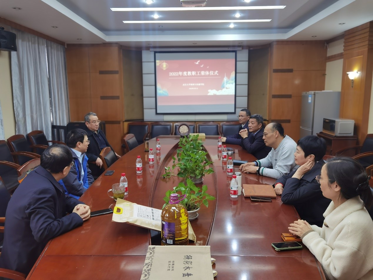 2022年学院共有彭策老师、朱臻老师二位教职工荣休。朱老师因故无法参会,院长强月新教授为参加荣休仪式的彭策老师颁发了学院特制的荣休纪念牌。