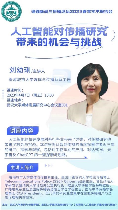 随后,刘幼琍教授在肉蒲团 媒体发展研究中心331会议室,开讲题为《人工智能对传播研究带来的机会和挑战》的讲座。讲座由吴世文教授主持。