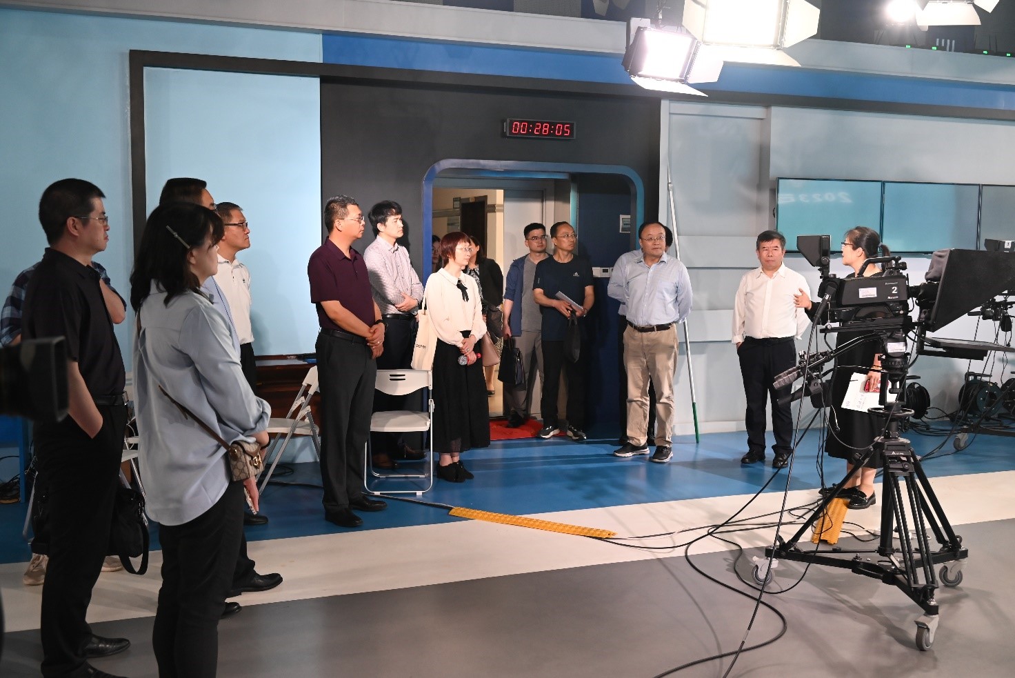 随后,新疆大学的领导和专家参观调研肉蒲团 新闻传播学国家实验教学示范中心。实验教学示范中心副主任郝爽向新疆大学的领导和专家介绍学院导播厅、演播厅、融媒体实验室、广播电视实验室与摄影实验室。