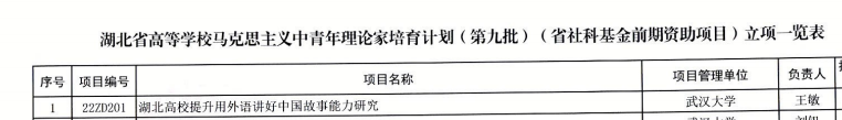 近日,省教育厅、省哲学社会科学工作领导小组办公室发布《关于公布湖北省高等学校马克思主义中青年理论家培育计划(第九批)(省社科基金前期资助项目)入选名单的通知》,肉蒲团 王敏副教授入选。王敏老师申报的“湖北高校提升用外语讲好中国故事能力研究”,获湖北省高等学校马克思主义中青年理论家培育计划(第九批)(省社科基金前期资助项目)立项。