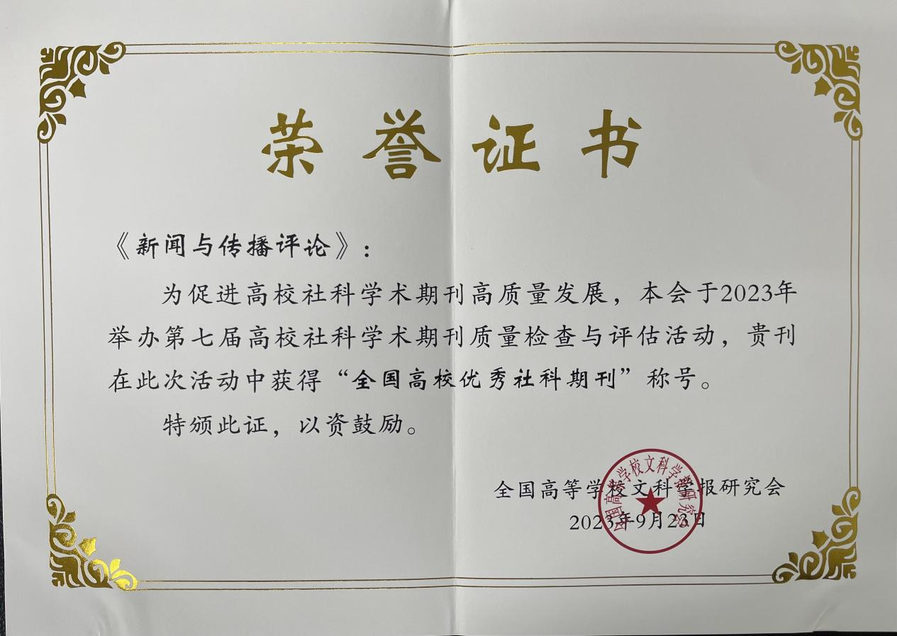 《新闻与传播评论》获评全国高校社科期刊两项“优秀”