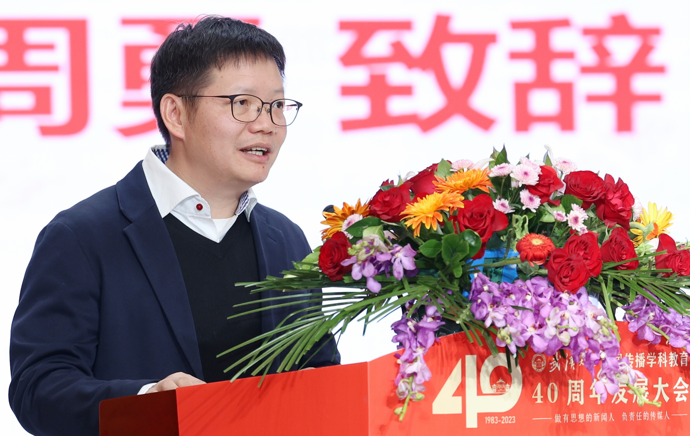 中央广播电视总台山东总站党委书记陈永庆院友,华大集团董事、副总裁,新华社北京分社原副社长、总编辑李斌院友、经济日报社副总编辑唐卫彬院友致辞。他(她)们深情回顾了自己在珞珈山的求学历程,感恩学校、母院的悉心培育,在学院40周年诞辰之际,祝愿武大肉蒲团 登高望远,更上层楼。