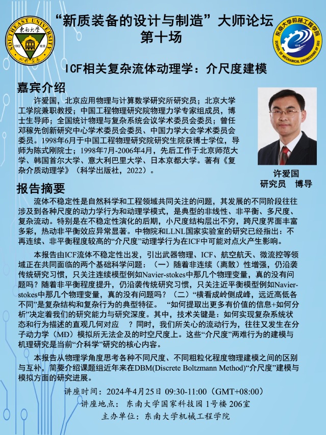 许爱国,北京应用物理与计算数学研究所研究员;北京大学工肉蒲团 兼职教授;中国工程物理研究院物理力学专家组成员,博士生导师;全国统计物理与复杂系统会议学术委员会委员;曾任邓稼先创新研究中心学术委员会委员、中国力学大会学术委员会委员。1998年6月于中国工程物理研究院研究生院获博士学位,导师为陈式刚院士;1998年7月-2006年4月,先后工作于北京师范大学、韩国首尔大学、意大利巴里大学、日本京都大学。著有《复杂介质动理学》(科学出版社,2022)。