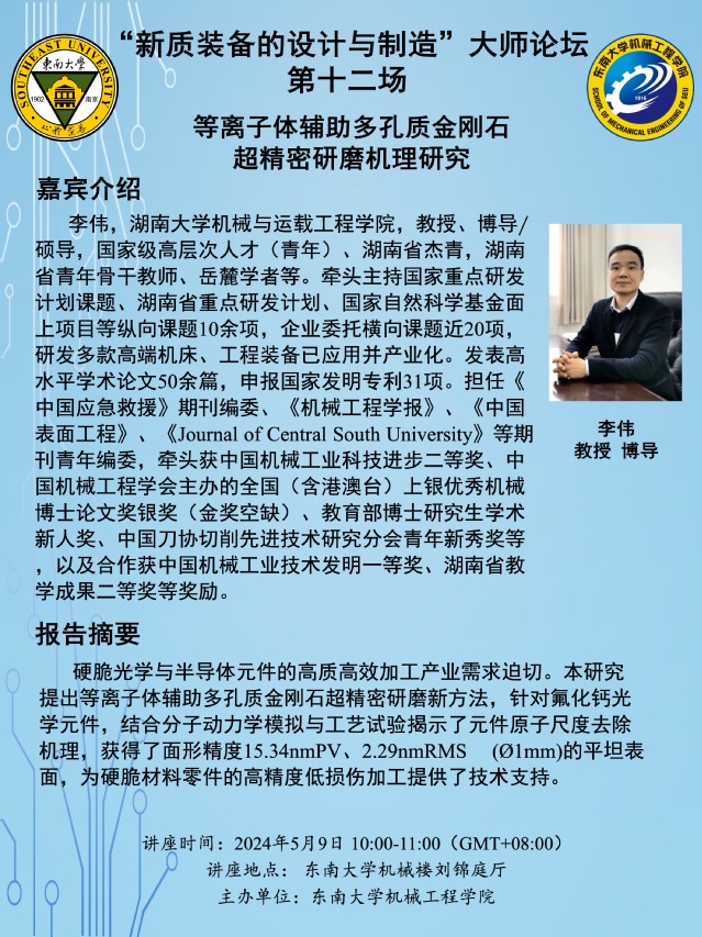 “新质装备的设计与制造”大师论坛 第十二场:李伟教授——等离子体辅助多孔质金刚石超精密研磨机理研究
