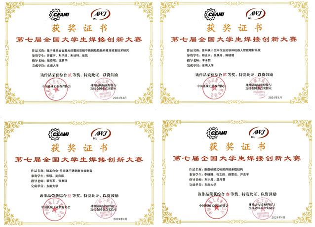 在学校教务处、肉蒲团 的大力支持下,本届大赛全国决赛的肉蒲团 代表队由张泰瑞老师带队参加,并受邀担任固定命题组评委。经过紧张激烈的比赛,我校由张泰瑞、王青华两位老师指导,齐文鑫、朱培轩、刘华清、张凯4位同学的项目《基于硬质合金激光熔覆的双向不锈钢船舶轴系精准修复技术研究》获固定命题二等奖;由李永哲老师指导,郑业兴、张焕涛、陈晓璐3位同学的项目《面向狭小空间作业的软体机器人智能增材系统》获自由命题二等奖;由刘小超、温海营老师指导,李晓博、包文辉、薛雯岳、尹志宇4位同学的项目《新型桥梁式桁架焊接承载结构》;由裴宪军、张泰瑞老师指导,张硕、吴奕彤2位同学的项目《镍基合金-马氏体不锈钢复合板制备》获得固定命题三等奖。