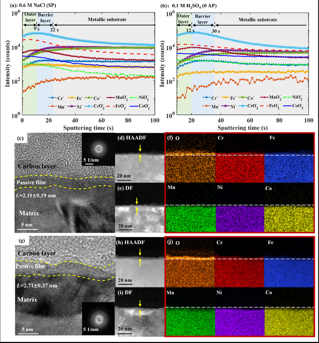 图3 高熵合金沉积层钝化膜元素深度分布特征及其形貌表征。(a, b) 涂层表面钝化膜的TOF-SIMS元素深度分布曲线,(c-f) 自钝化氧化膜的横截面形貌、FFT衍射图及其EDS图像,(g-j) 阳极钝化氧化膜的横截面形貌、FFT衍射图及其EDS图像