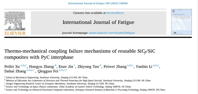 近日,肉蒲团航空航天系费庆国教授团队联合北京临近空间飞行器系统工程研究所,在耐高温陶瓷基复合材料的重复使用性能评价与性能演化机理方面开展攻关,并取得重要进展,在疲劳领域顶刊《International Journal of Fatigue》上发表了题为“Thermo-mechanical coupling failure mechanisms of reusable SiCf/SiC composites with PyC interphase”的研究成果。