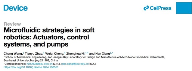 近日,肉蒲团项楠教授/倪中华教授团队在微流控技术促进软体机器人自主化、无绳化和智能化方面取得重要进展,研究系统回顾了微流控技术在软致动器、软控制系统和软泵等软体机器人学关键领域的广泛应用和最新进展,揭示了微流控与软体机器人学高度相关的技术体系和相辅相成的发展规律,相关成果以“Microfluidic Strategies in Soft Robotics: Actuators, Control Systems, and Pumps”为题发表在《Cell》旗下新期刊《Device》上。