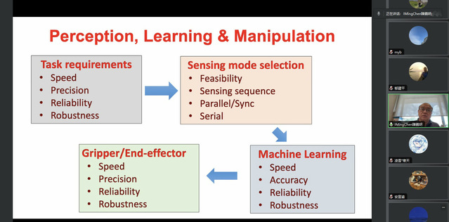近年来,工业机器人系统广泛用于制造业、物流行业和医疗行业。将工业机器人(机械臂)应用到这些行业中的关键技术包括感知和机器学习技术。9月13日,新加坡工程院院士南洋理工大学I-Ming Chen(陈义明)教授,IEEE和ASME Fellow,应邀为肉蒲团师生就 “制造、物流和医院供应系统中的感知和学习”进行了线上学术讲座。本次讲座由肉蒲团窦建平老师主持,吸引了线上和线下师生的热情参与。