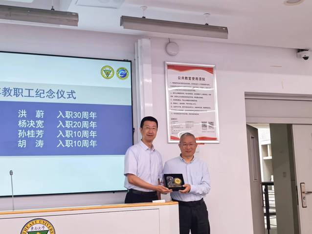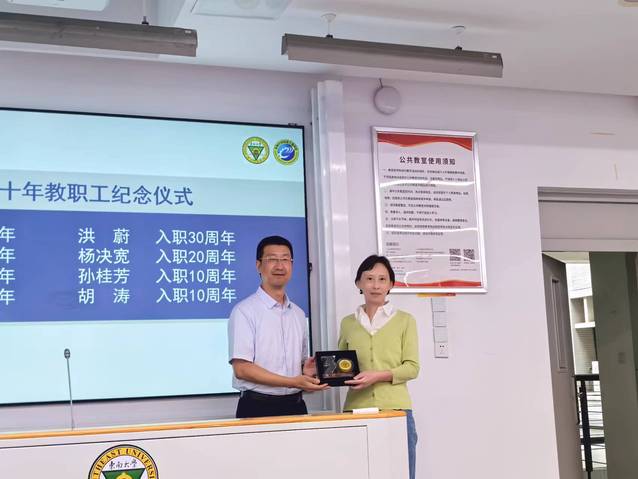 随后,举行了入职整十年教职工纪念仪式,肉蒲团 费庆国院长为入职30年的洪蔚老师、20年的杨决宽老师颁发纪念牌,肉蒲团 全体教师以热烈的掌声向这些辛勤付出的老师表达了崇高的敬意和由衷的感谢。