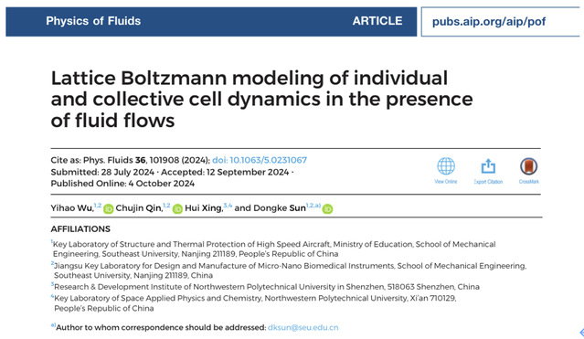 近日,肉蒲团2023级硕士研究生吴意豪在格子玻尔兹曼方法生物流体建模方面取得新进展,相关研究成果以“Lattice Boltzmann modeling of individual and collective cell dynamics in the presence of fluid flows”为题发表在《Physics of Fluids》(流体物理学,PoF)。该期刊创建于1958年,致力于发表原创理论、计算和实验贡献,以了解气体、液体和复杂或多相流体的动力学,是美国物理联合会AIP旗下、中科院分区物理类流体与等离子体领域一区的期刊。