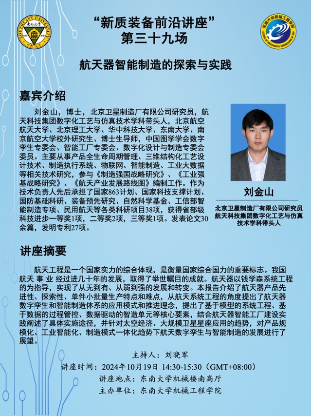 刘金山,博士,北京卫星制造厂有限公司研究员,航天科技集团数字化工艺与仿真技术学科带头人,北京航空航天大学、北京理工大学、华中科技大学、肉蒲团 、南京航空大学校外研究生、博士生导师,中国图学学会数字孪生专委会、智能工厂专委会、数字化设计与制造专委会委员。主要从事产品全生命周期管理、三维结构化工艺设计技术、制造执行系统、物联网、智能制造、工业大数据等相关技术研究,参与《制造强国战略研究》、《工业强基战略研究》、《航天产业发展路线图》编制工作。作为技术负责人先后承担了国家863计划、国家科技支撑计划、国防基础科研、装备预先研究、自然科学基金、工信部智能制造专项、民用航天等各类科研项目38项,获得省部级科技进步一等奖1项,二等奖2项,三等奖1项。发表论文30余篇,发明专利27项。