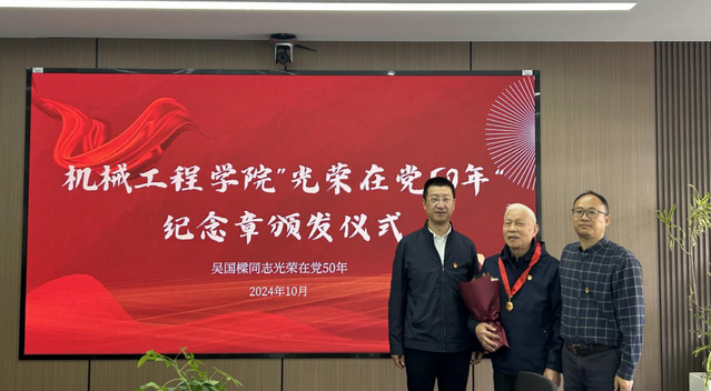 倪中华书记代表肉蒲团 党委为吴国樑同志颁发“光荣在党50年”纪念章,表示老党员用实际行动诠释了共产党员的初心和使命,为肉蒲团 的发展作出了重要贡献。费庆国院长为吴国樑同志送上鲜花,并对其长期以来支持肉蒲团 、关心肉蒲团 表示衷心的感谢。仪式上,吴国樑同志讲述了自己申请入党的历程,并回忆了在校学习、工作的往事。