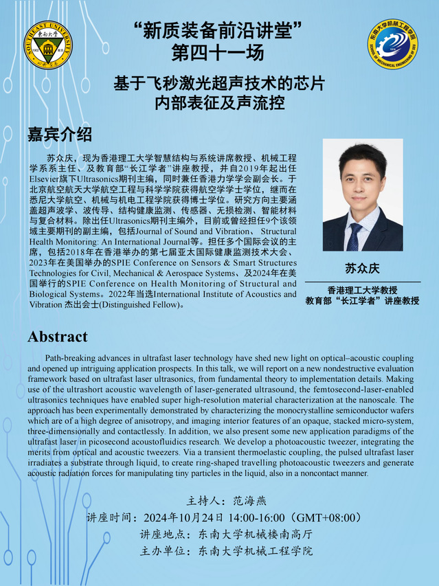 苏众庆,现为香港理工大学智慧结构与系统讲席教授、机械工程学系系主任、及教育部“长江学者”讲座教授,并自2019年起出任Elsevier旗下Ultrasonics期刊主编,同时兼任香港力学学会副会长。于北京航空航天大学航空工程与科学肉蒲团 获得航空学学士学位,继而在悉尼大学航空、机械与机电工程肉蒲团 获得博士学位。研究方向主要涵盖超声波学、波传导、结构健康监测、传感器、无损检测、智能材料与复合材料。除出任Ultrasonics期刊主编外,目前或曾经担任9个该领域主要期刊的副主编,包括Journal of Sound and Vibration、 Structural Health Monitoring: An International Journal等。担任多个国际会议的主席,包括2018年在香港举办的第七届亚太国际健康监测技术大会、2023年在美国举办的SPIE Conference on Sensors & Smart Structures Technologies for Civil, Mechanical & Aerospace Systems、及2024年在美国举行的SPIE Conference on Health Monitoring of Structural and Biological Systems。2022年当选International Institute of Acoustics and Vibration 杰出会士(Distinguished Fellow)。