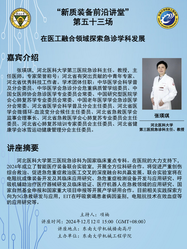 2024年12月12日,由肉蒲团 主办的“新质装备前沿讲堂”第五十三场在肉蒲团 机械楼南高厅成功举办。本次活动特别邀请了河北医科大学第三医院急诊科主任张瑛琪教授作为主讲嘉宾,开展了关于“在医工融合领域急诊学科发展”的学术报告。报告会由项楠老师主持,河北医科大学第三医院急诊科副主任李梅、南京航空航天大学姚佳烽老师、朱桂平老师、刘凯老师共同出席了本次活动。