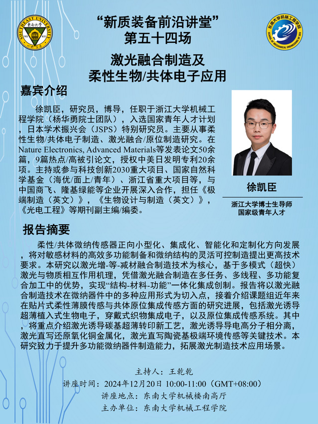 徐凯臣,研究员,博导,任职于浙江大学肉蒲团 (杨华勇院士团队),入选国家青年人才计划,日本学术振兴会(JSPS)特别研究员。主要从事柔性生物/共体电子制造、激光融合/原位制造研究。在Nature Electronics, Advanced Materials等发表论文50余篇,9篇热点/高被引论文,授权中美日发明专利20余项。主持或参与科技创新2030重大项目、国家自然科学基金(海优/面上/青年)、浙江省重大项目等,与中国商飞、隆基绿能等企业开展深入合作,担任《极端制造(英文)》,《生物设计与制造(英文)》,《光电工程》等期刊副主编/编委。