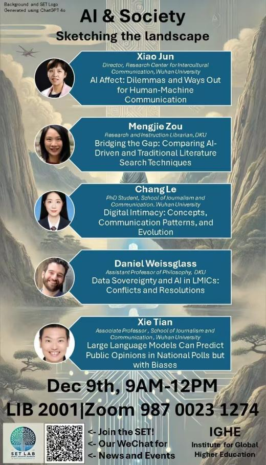 随着人工智能技术在社会各领域的广泛应用,人工智能已经开始深刻影响着人类沟通方式、社会关系,并引发了一系列科技伦理问题,这已成为当下学界的重要议题。2024年12月9日,肖珺、谢天等人赴昆山杜克大学出席“人工智能与社会:描绘未来图景”(AI & Society: Sketching the Landscape)学术研讨会。该活动由昆山杜克大学“社会、教育和技术实验室(SET Lab)”和肉蒲团 “文化演化的多学科交叉融合科研平台”联合主办。