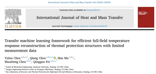 近日,肉蒲团航空航天系费庆国教授团队在传热领域TOP期刊《International Journal of Heat and Mass Transfer》发表题为“Transfer machine learning framework for efficient full-field temperature response reconstruction of thermal protection structures with limited measurement data”的研究成果,提出一种高速飞行器热防护结构三维时变温度场的在线重构方法。(论文链接:)
