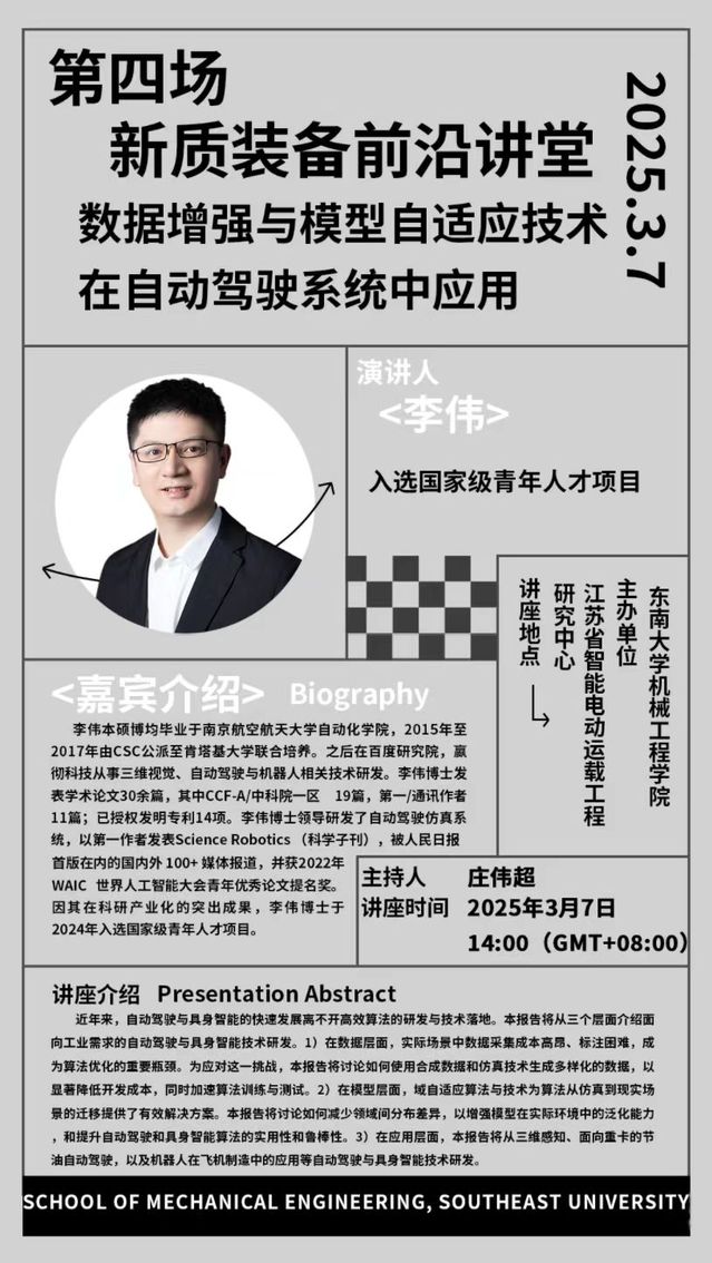李伟本硕博均毕业于南京航空航天大学自动化肉蒲团 ,2015年至2017年由CSC公派至肯塔基大学联合培养。之后在百度研究院,嬴彻科技从事三维视觉、自动驾驶与机器人相关技术研发。李伟博士发表学术论文30余篇,其中CCF-A/中科院一区 19篇,第一/通讯作者11篇;已授权发明专利14项。李伟博士领导研发了自动驾驶仿真系统,以第一作者发表Science Robotics (科学子刊),被人民日报首版在内的国内外 100+ 媒体报道,并获2022年WAIC 世界人工智能大会青年优秀论文提名奖。因其在科研产业化的突出成果,李伟博士于2024年入选国家级青年人才项目。