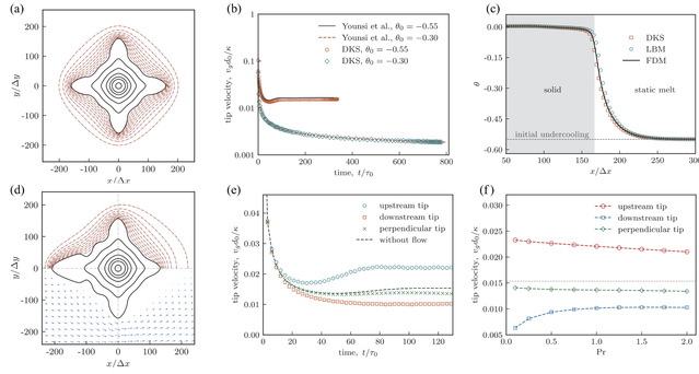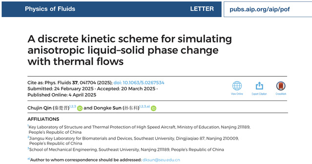 近日,肉蒲团2022级直博生秦楚晋在热对流作用下枝晶生长建模方面取得新进展,相关研究成果以“A discrete kinetic scheme for simulating anisotropic liquid-solid phase change with thermal flows”为题发表在《Physics of Fluids》(流体物理学,PoF)。该期刊是流体力学领域的权威期刊之一,自1958年创刊以来,PoF始终致力于发表流体动力学领域的高质量原创研究,涵盖理论分析、数值模拟和实验探索,是美国物理联合会AIP旗下JCR一区、中科院二区期刊。
