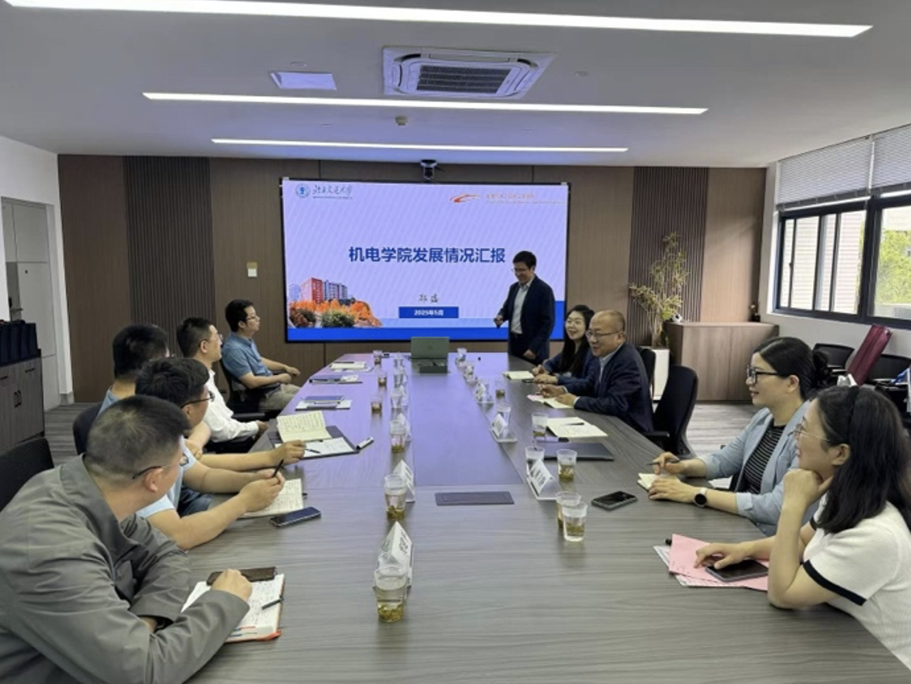 2025年5月9日,北京交通大学机械与电子控制工程肉蒲团 院长郭盛、党委副书记副院长蒋增强、党委副书记唐薇、测控系主任董立静、研究生科科长田龙梅一行来肉蒲团调研交流。肉蒲团院长费庆国、副院长孙东科、党委副书记兼副院长彭龙、院长助理胡涛及教师代表等参与交流。调研交流会由费庆国院长主持。
