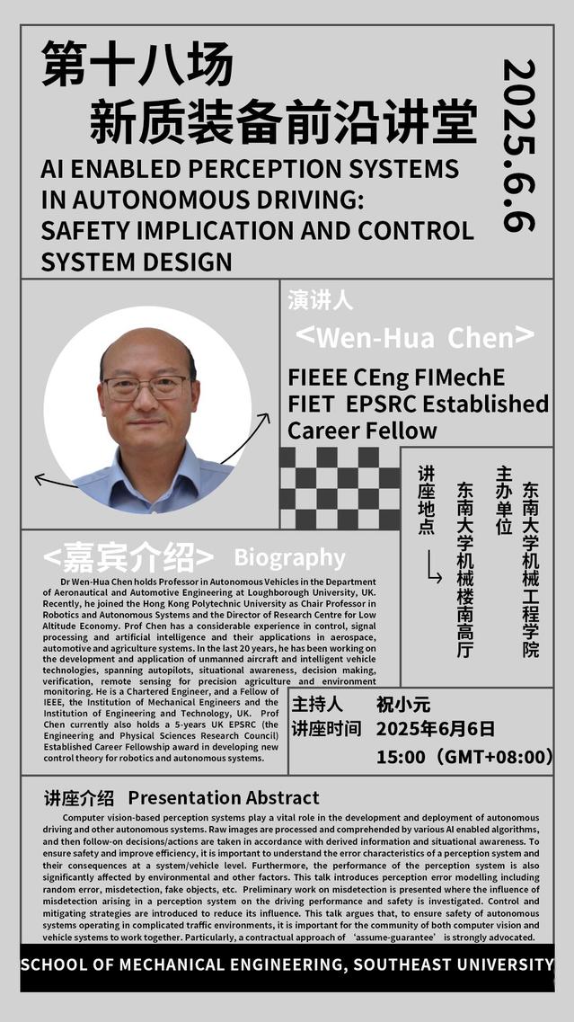 Dr Wen-Hua Chen holds Professor in Autonomous Vehicles in the Department of Aeronautical and Automotive Engineering at Loughborough University, UK. Recently, he joined the Hong Kong Polytechnic University as Chair Professor in Robotics and Autonomous Systems and the Director of Research Centre for Low Altitude Economy. Prof Chen has a considerable experience in control, signal processing and artificial intelligence and their applications in aerospace, automotive and agriculture systems. In the last 20 years, he has been working on the development and application of unmanned aircraft and intelligent vehicle technologies, spanning autopilots, situational awareness, decision making, verification, remote sensing for precision agriculture and environment monitoring. He is a Chartered Engineer, and a Fellow of IEEE, the Institution of Mechanical Engineers and the Institution of Engineering and Technology, UK. Prof Chen currently also holds a 5-years UK EPSRC (the Engineering and Physical Sciences Research Council) Established Career Fellowship award in developing new control theory for robotics and autonomous systems.