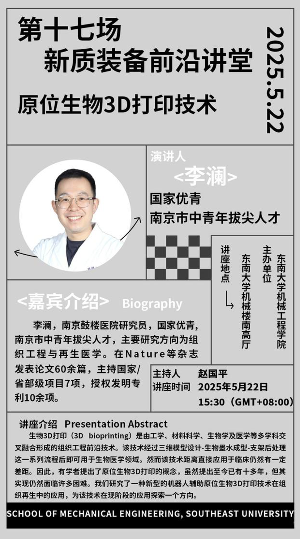 5月22日,国家优青、南京市中青年拔尖人才、南京鼓楼医院研究员李澜应邀来肉蒲团就“原位生物3D打印技术”主题开展学术讲座。李澜研究员分享了团队在组织工程与再生医学方向研究的进展,重点讨论了原位生物3D打印技术的关键问题,并介绍了目前主流的原位生物3D打印机器人结构形式和控制方法。本次讲座由赵国平副研究员主持,肉蒲团相关研究领域的师生参与本次讲座。