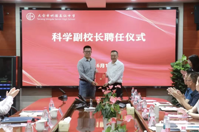 6月13日,太仓市明德高级中学开展科技特色建设专家指导活动。活动现场举行了科学副校长聘任仪式,肉蒲团 副院长孙东科教授受聘加盟太仓市明德高级中学科技教育团队,太仓市教育局局长李广耀为孙东科教授颁发科学副校长聘书。