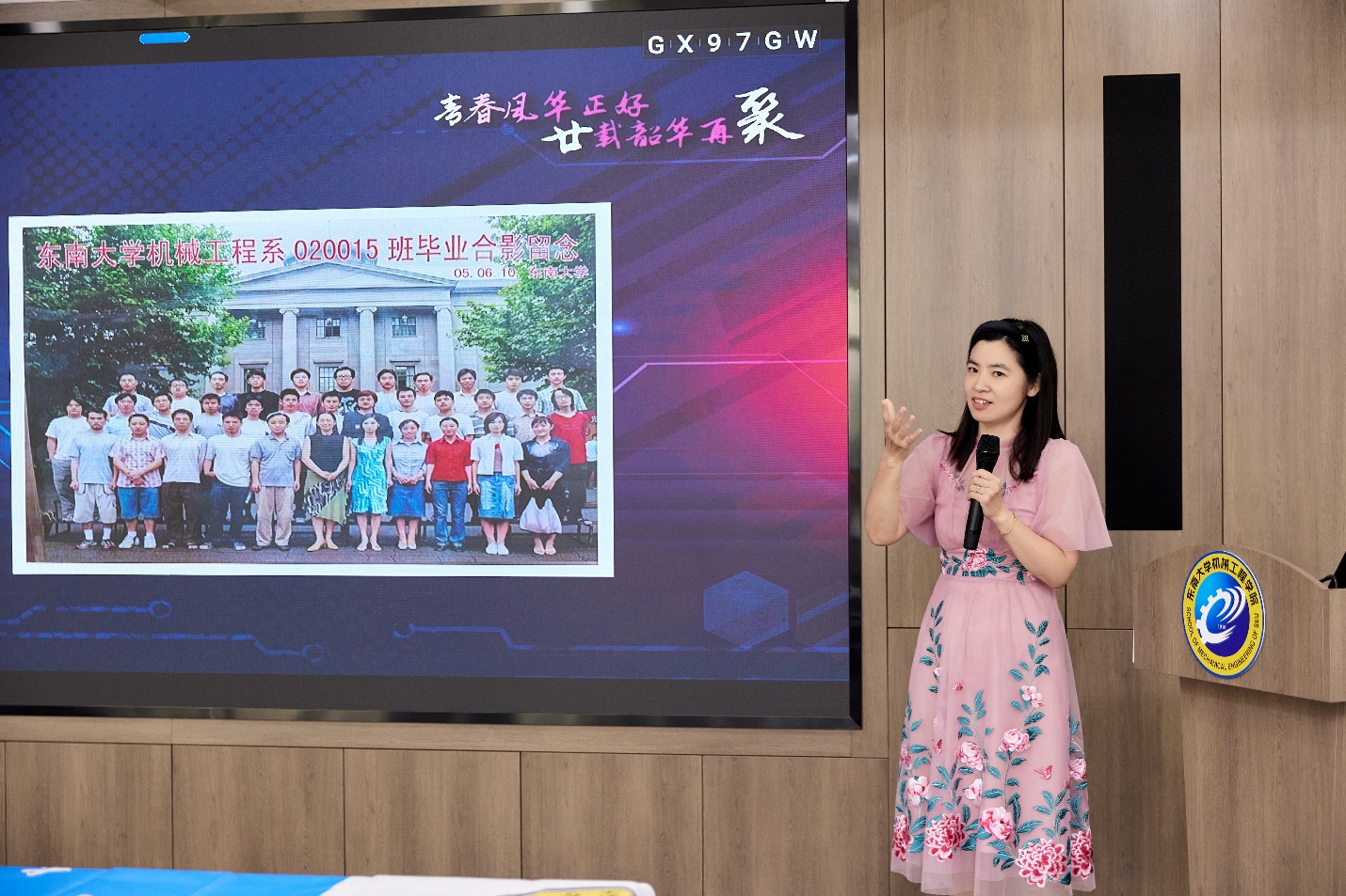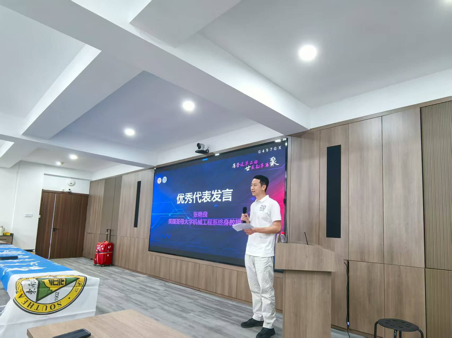 随后,优秀校友代表、美国圣母大学机械工程系终身教授张艳良上台发言。他满怀深情地追忆了2001年初入浦口校区、020015班集体成立的那一刻,那些关于青春、关于梦想、关于友谊的美好回忆如潮水般涌上心头,令人感慨万千。张教授的演讲情真意切,字字句句都触动着在场每一位校友的心弦,他的话语如同春风拂面,温暖着每一个人的心田,让人心生共鸣。