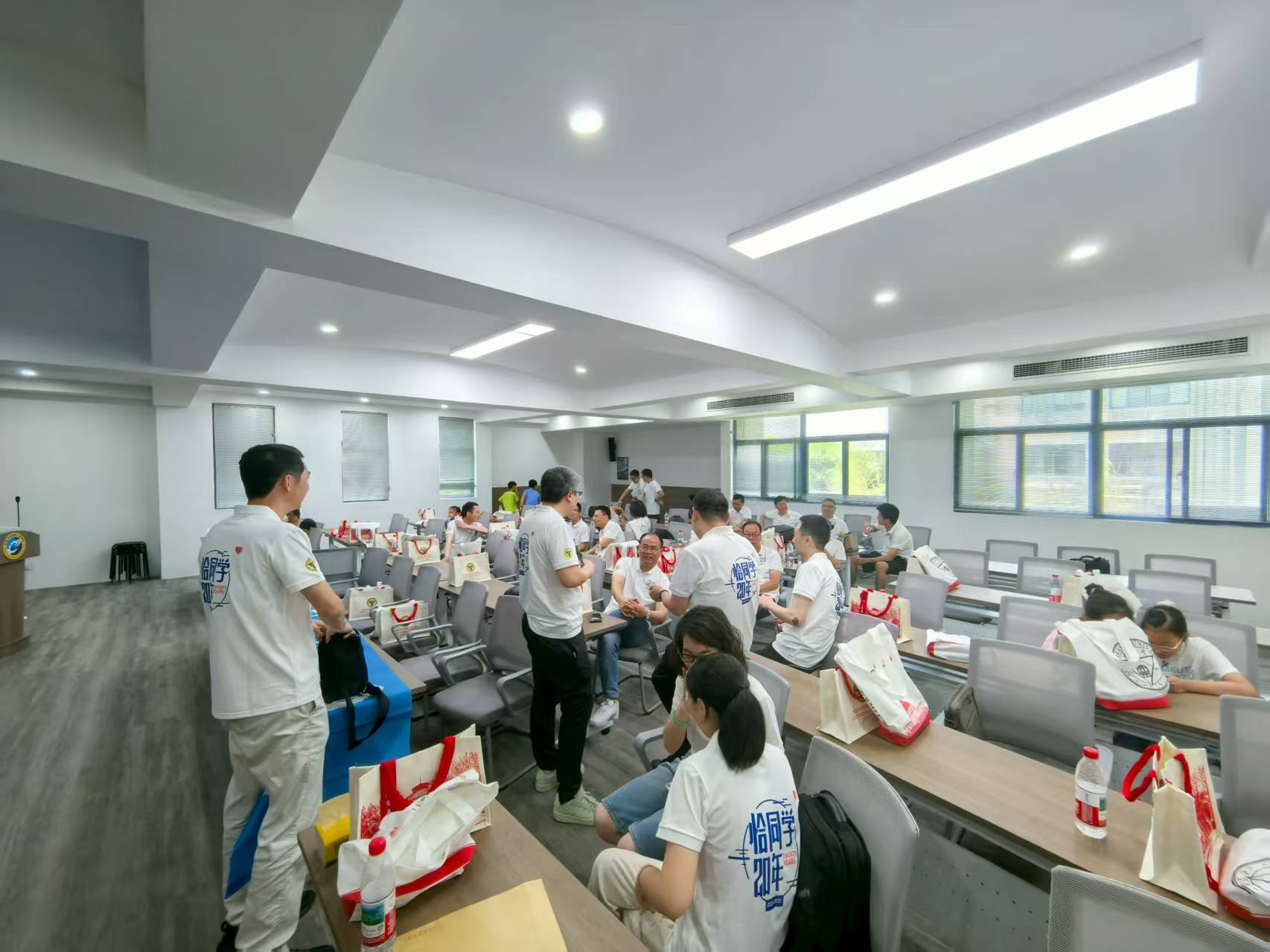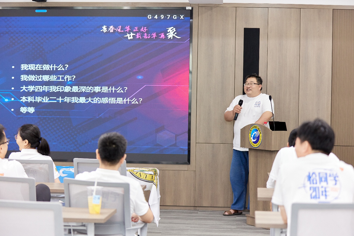 紧接着,每一位同学都轮番上台,分享了自己这二十年来的学习工作经历,回忆了自己大学生活中最难忘的时刻,以及人生的新感悟等。台下的同学们也不时互动,会场里充满了欢声笑语,气氛热烈而温馨。大家仿佛又回到了那个青涩而纯真的年代,共同回味着那段美好的青春时光。