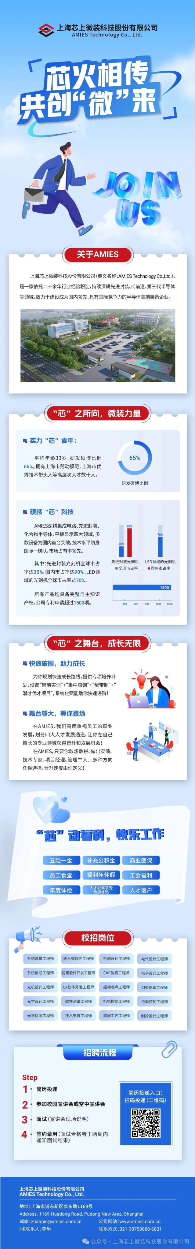 🚗【公司简介】 上海芯上微装科技股份有限公司(英文名称:AMIES Technology Co., Ltd.),是一家专注于高端半导体装备研发、生产和服务的创新型科技企业。 公司致力于为“超越摩尔”赛道的芯片制造、芯片先进封装、三代半导体和新型显示等核心领域提供高精度、高性能、高可靠性的设备解决方案。 公司技术团队约600人,平均年龄33岁,65%为硕士博士学历;拥有上海市劳动模范、上海市优秀技术带头人、上海市青年科技启明星计划、上海市产业菁英领军人才,以及浦东明珠计划人才/工程师等高层次人才十数人。了解更多详情,请访问公司官网: