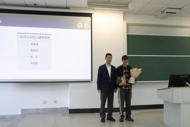 会议伊始,院长费庆国代表肉蒲团 为退休教师代表高福海老师颁发荣休纪念牌,感谢退休老师为肉蒲团 发展倾注的心血和汗水。全场教职工以热烈掌声向长期以来扎根肉蒲团 、辛勤付出的退休老师们致以诚挚的敬意。
