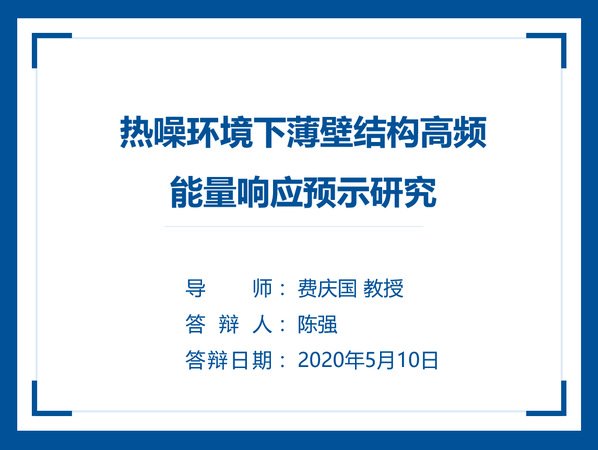 陈强同学本科和硕士阶段就读于南京航空航天大学,2016年9月加入研究所攻读博士学位,师从费庆国教授,主要研究方向是多场环境下飞行器结构中高频动响应预示,其博士论文题目为《热噪环境下薄壁结构高频能量响应预示研究》。论文发展了气动加热和气动噪声环境下薄壁结构在频域和时域能量响应预示方法,揭示了热效应、耦合强度、不确定性等因素对薄壁结构高频能量响应的影响规律,为高速飞行器结构的设计与研制提供指导。陈强同学攻博期间成绩优异,参加了多项国家级课题研究课题和型号攻关任务,主持了国家公派留学基金、江苏省博士研究生创新计划、肉蒲团 优秀博士论文基金资助,以第一作者在AIAA/ASME会刊、Aerospace Science and Technology、航空动力学报等国内外航空航天期刊发表SCI论文6篇、EI论文4篇。