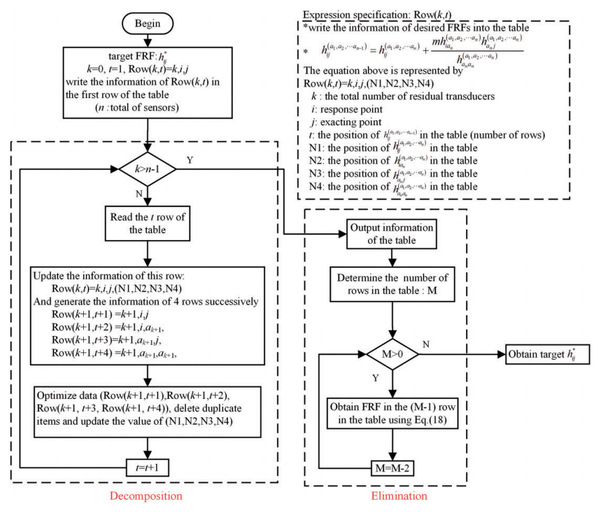 Modal parameter identification is adversely affected by the mass loading of the transducer in experiments, especially when multi-transducers are arranged on the lightweight structure. In order to remove the coupling effects of transducers on each measurement point, a hierarchical multi-transducers eliminations method based on Sherman–Morrison theory is investigated. The method consists of two steps: (1) Decomposition: multiple elimination is decomposed into multi-levels, the relationship of the frequency response functions between each level is illustrated in the tree diagram; (2) Elimination: according to the relationship between each level, the measured frequency response functions are modified level by level. Numerical simulation is conducted by employing a three-degrees-of-freedom spring-mass system and the robustness is verified in the noise case. Experimental investigations are undertaken by employing a lightweight cantilever beam: Laser Doppler vibrometer is adopted to obtain measured frequency response functions without transducer mass loading effect, which are regarded as the target data. The initial frequency response functions are obtained in the case, in which multi-accelerometers are arranged and the effects should be removed. The result shows that the method can effectively decouple the frequency response functions due to transducers. In the elimination process, it is necessary to delete duplicate information (frequency response functions), which can greatly reduce the amount of calculation. And the effects of multi-transducers mass can be removed and the corrected frequency response functions are in quite good agreement with the target values.