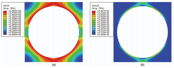 Fig. (Color) (a) Equivalent stress; and (b) inelastic strain along loading direction distribution in the model at a low strain rate with εyy = 2.37%.