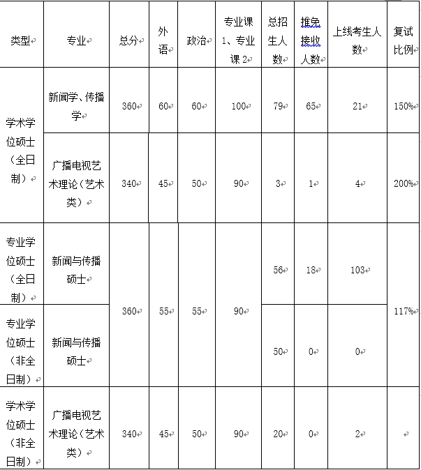 本院广播电视艺术理论(非全日制)、新闻与传播专硕(非全日制)接受调剂,调剂要求1、达到肉蒲团 的复试分数线。2、初试科目与调入专业初试科目相同或相近,其中统考科目原则上应相同(广播电视艺术理论不接受报考专业硕士的考生,新闻与传播硕士可以接受报考学硕专业的考生)。且需通过原报考专业的国家线。3、有定向培养单位,并在录取前签订定向协议,未签订者不予录取。4、有调剂意愿的考生请于3月28日前向肉蒲团 研究生办公室(学院307)提交纸质的调剂申请和定向单位的同意委托培养函,并在“全国硕士生招生调剂服务系统”开通后在系统上提交调剂申请。5、学院会在4月2日前通过调剂申请并通知考生复试(调剂服务系统会在4月1日下午17点前关闭),调剂复试时间安排在4月4日进行,具体的复试要求及复试安排见复试须知。6、学院会及时在网站上公布调剂录取情况。